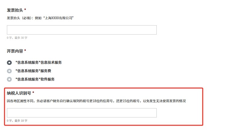 应税务要求,增值税发票开具需要提供申请公司的纳税人识别号。(如示例图)